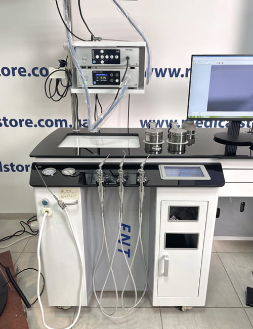 Unit laryngologiczny Pengkang Electrical PK-3202 – wielofunkcyjna stacja robocza dla otolaryngologa do diagnostyki i leczenia chorób ucha, gardła i nosa. System umożliwia przeprowadzanie szerokiego zakresu procedur klinicznych – od badania pacjenta po zabiegi terapeutyczne.