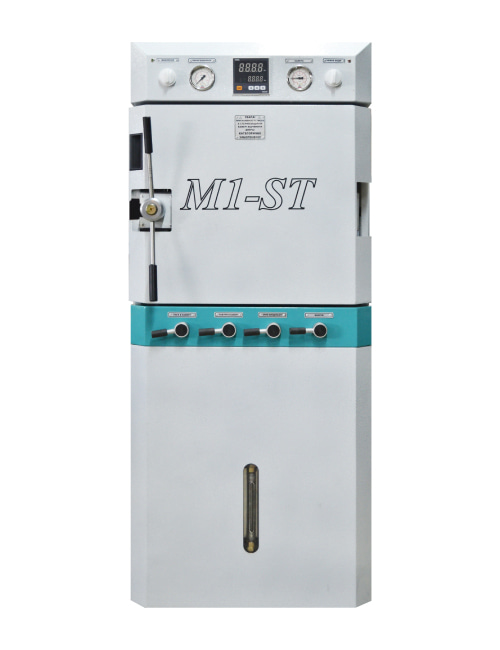 Medyczny sterylizator parowy Zlotov M1-ST-100-HM o pojemności 100 litrów z poziomą komorą i półautomatycznym systemem sterowania procesami. Przeznaczony do sterylizacji i dezynfekcji sprzętu medycznego oraz laboratoryjnego za pomocą pary wodnej pod wysokim ciśnieniem.